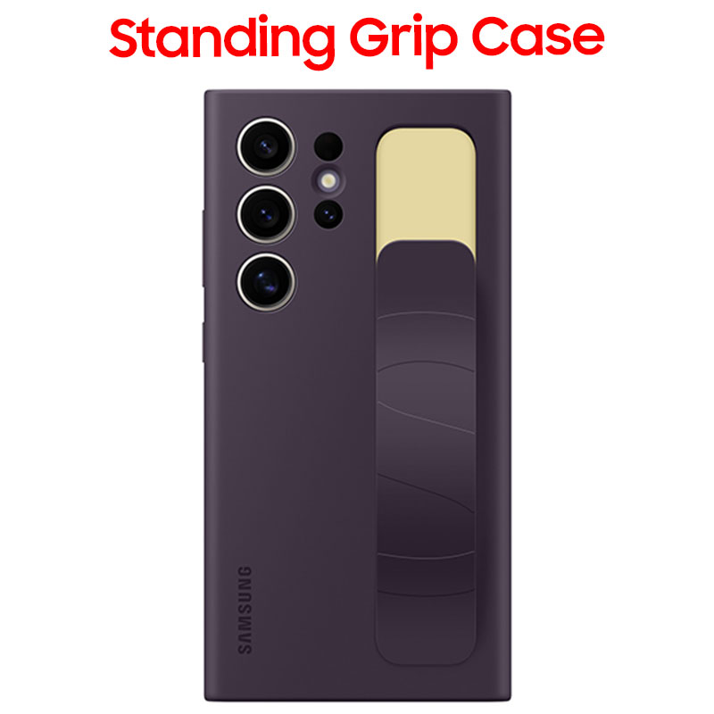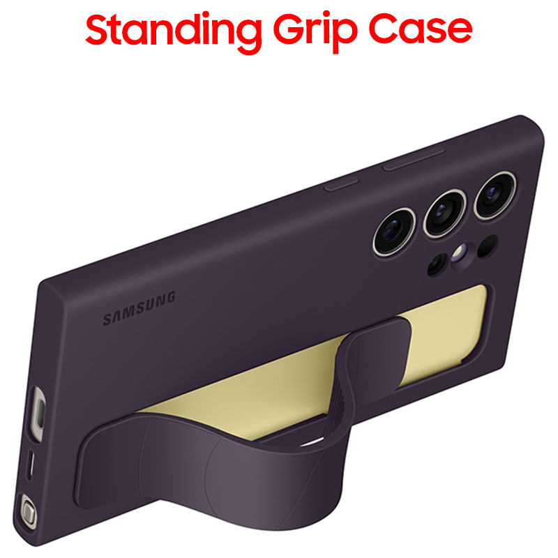 • Hold your phone with confidence or let it stand on its own with the new Galaxy S24 Ultra Standing Grip Case.¹ The sturdy strap on the smooth silicone case ensures a secure grip, while the built-in kickstand lets you enjoy your favorite content hands-free.